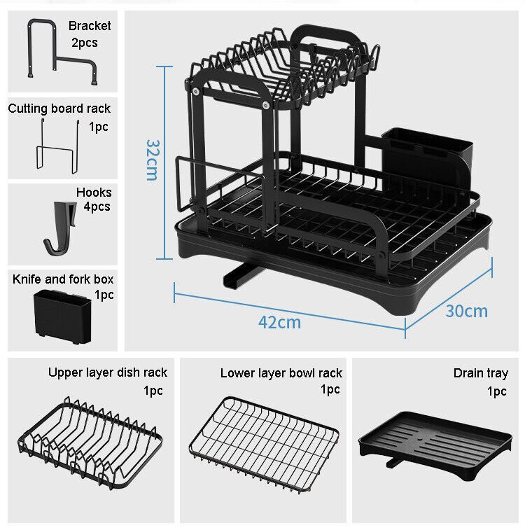 2 Tier Dish Rack Plate Cup Drying Drainer Storage Drip Tray Cutlery Holder UK